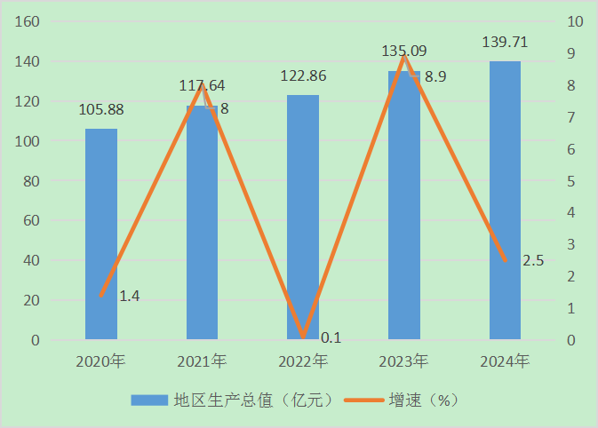 地區(qū)生產(chǎn)總值。2024年全縣地區(qū)生產(chǎn)總值(GDP)完成139.71億元,同比增長2.5%。其中,第一產(chǎn)業(yè)增加值51.12億元,同比下降0.4%;第二產(chǎn)業(yè)增加值25.54億元,同比增長8.6%;第三產(chǎn)業(yè)增加值63.05億元,同比增長2.4%。三次產(chǎn)業(yè)結(jié)構(gòu)比為36.6:18.3:45.1。按年平均人口數(shù)據(jù)計算,人均地區(qū)生產(chǎn)總值48577元。