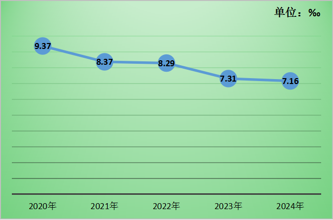 2024年全年出生人口2368人,出生率為7.16‰,政策外多孩出生229人,政策外多孩率為9.67%,出生男孩1343人,女孩1025人,出生人口性別比(以女性為100)為131:100。