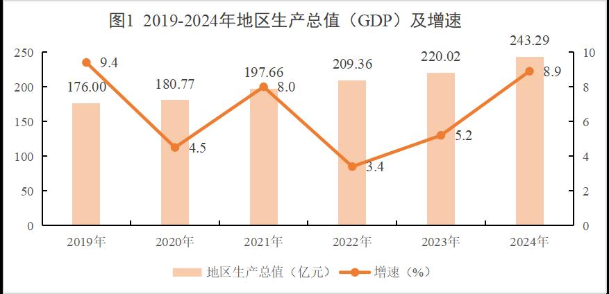 根據(jù)縣(區(qū))地區(qū)生產(chǎn)總值統(tǒng)一核算初步結(jié)果,2024年,全區(qū)實現(xiàn)地區(qū)生產(chǎn)總值(GDP)243.29億元,比上年增長8.9%。其中,第一產(chǎn)業(yè)增加值18.04億元,增長3%;第二產(chǎn)業(yè)增加值130.77億元,增長11.3%;第三產(chǎn)業(yè)增加值94.47億元,增長7%。三次產(chǎn)業(yè)對經(jīng)濟增長的貢獻率分別為3.2%、66.5%、30.2%,分別拉動經(jīng)濟增長0.3、5.9、2.7個百分點。三次產(chǎn)業(yè)結(jié)構(gòu)為7.4:53.8:38.8。