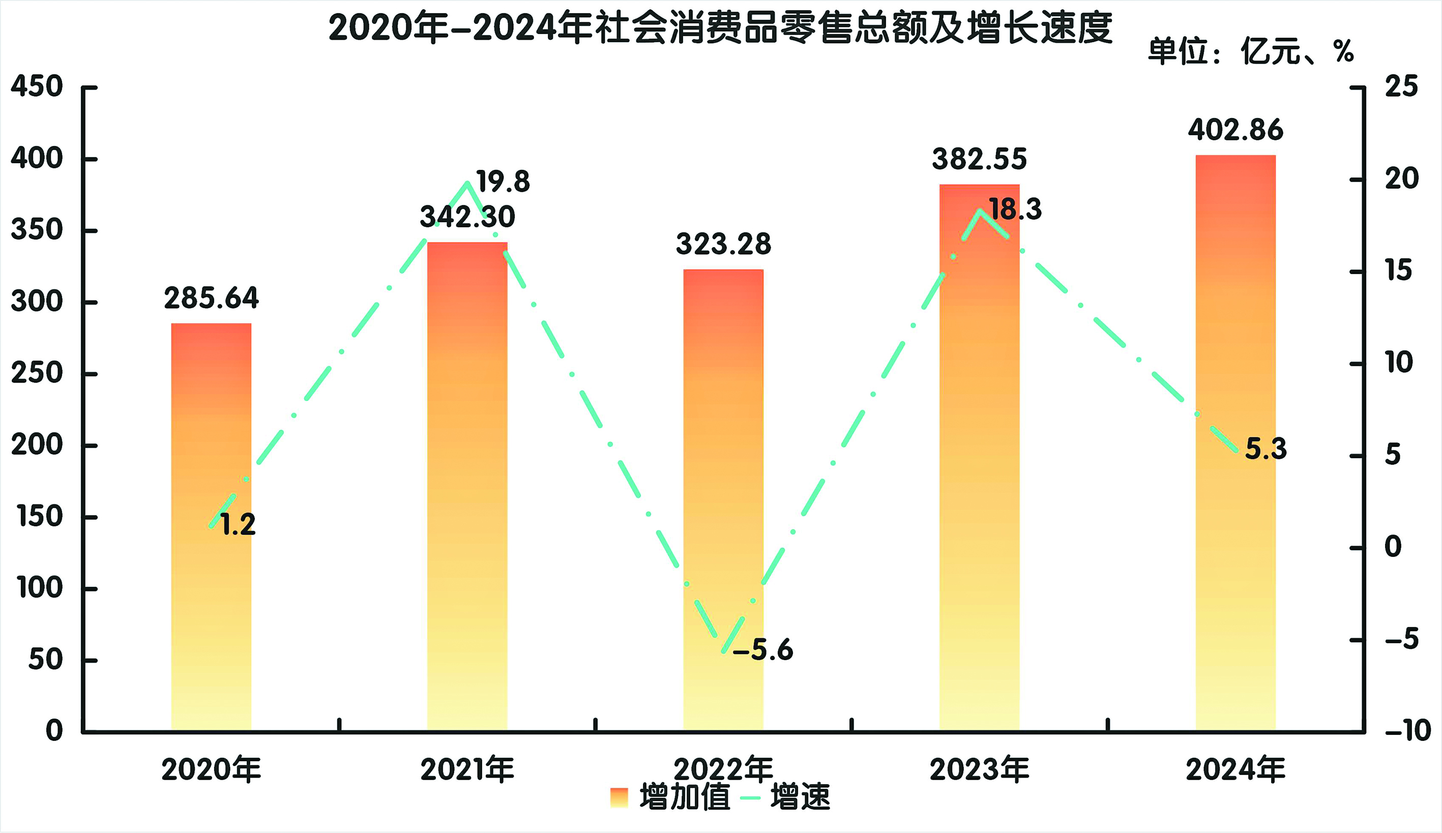 全年地區(qū)社會(huì)消費(fèi)品零售總額402.86億元,比上年增長5.3%。按經(jīng)營地分,城鎮(zhèn)消費(fèi)品零售額334.18億元,增長5.6%;鄉(xiāng)村消費(fèi)品零售額68.68億元,增長4.0%。按消費(fèi)類型分,商品零售331.89億元,增長5.0%;餐飲收入70.96億元,增長6.9%。報(bào)告模板_十四五_資料共享