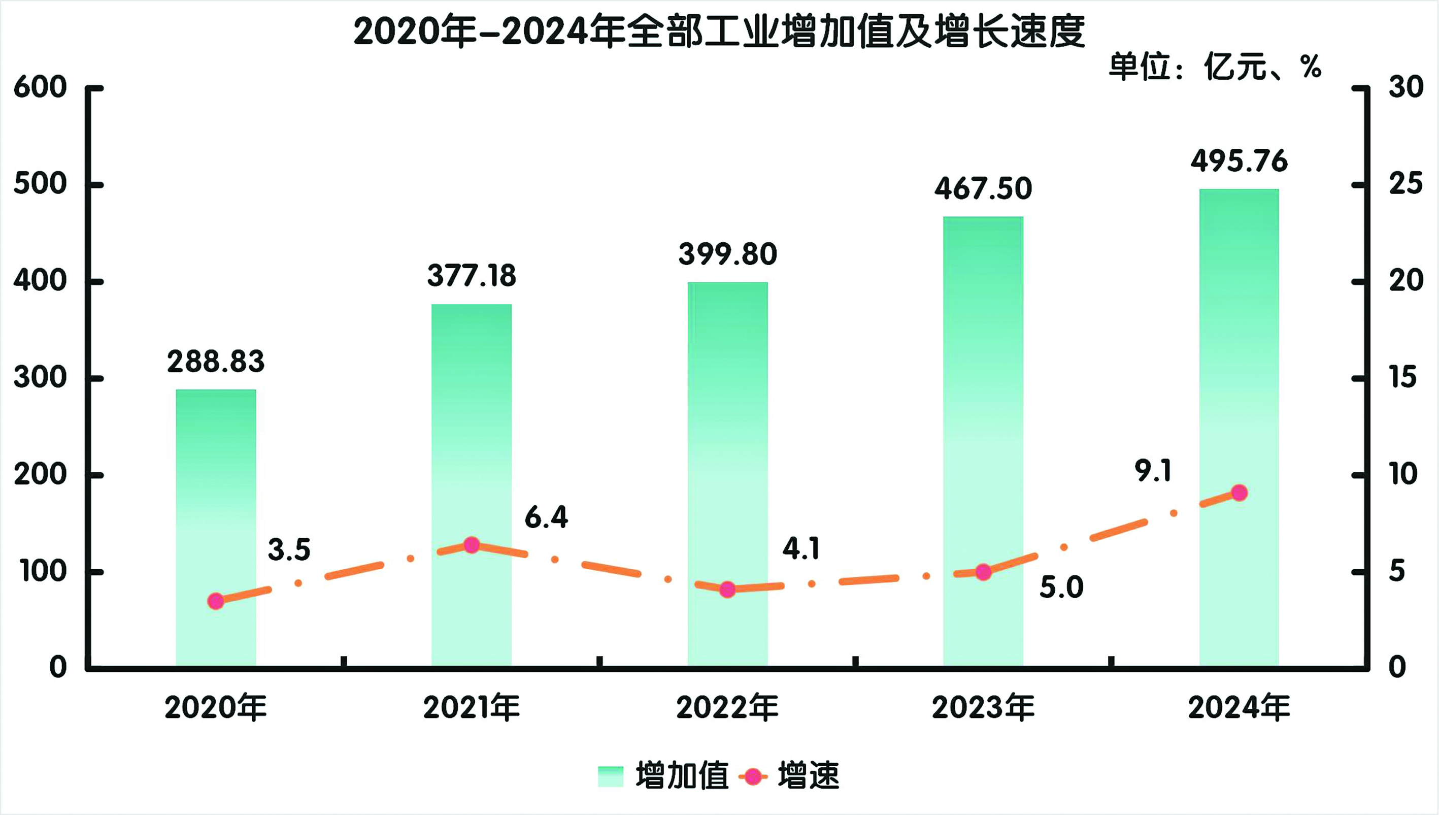 全年全部工業(yè)增加值495.76億元,比上年增長9.1%。規(guī)模以上工業(yè)增加值增長8.2%。在規(guī)模以上工業(yè)中,分經(jīng)濟(jì)類型看,外商及港澳臺(tái)投資企業(yè)增長19.5%,股份制企業(yè)增長8.1%。按所有制看,非公有制經(jīng)濟(jì)增長15.4%,公有制經(jīng)濟(jì)增長2.0%。分門類看,采礦業(yè)增長16.0%,制造業(yè)增長2.7%,電力、熱力、燃?xì)饧八纳a(chǎn)和供應(yīng)業(yè)增長9.7%。新動(dòng)能持續(xù)發(fā)力,戰(zhàn)略新興產(chǎn)業(yè)增加值增長18.5%。模版下載_十四五_資料共享