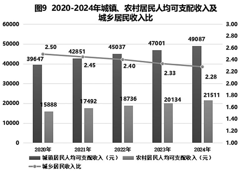 全年全市居民人均可支配收入35303元,比上年增長5.3%。其中,城鎮(zhèn)居民人均可支配收入49087元,增長4.4%;農(nóng)村居民人均可支配收入21511元,增長6.8%。城鄉(xiāng)居民人均可支配收入比為2.28:1,比上年縮小0.05。