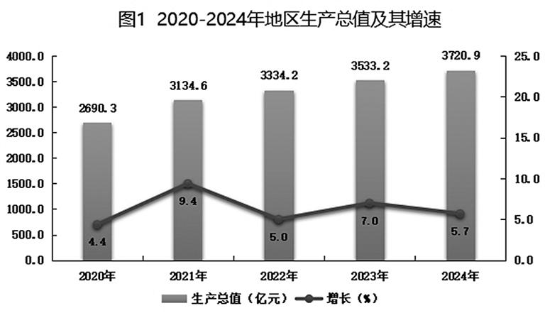 經(jīng)省統(tǒng)計(jì)局統(tǒng)一核算,全年全市地區(qū)生產(chǎn)總值3720.9億元,比上年增長5.7%。其中,第一產(chǎn)業(yè)增加值353.1億元,增長2.6%;第二產(chǎn)業(yè)增加值1442.9億元,增長7.7%;第三產(chǎn)業(yè)增加值1924.9億元,增長4.6%。三次產(chǎn)業(yè)對經(jīng)濟(jì)增長的貢獻(xiàn)率分別為4.7%、54.3%和41.0%。經(jīng)濟(jì)結(jié)構(gòu)進(jìn)一步優(yōu)化。三次產(chǎn)業(yè)結(jié)構(gòu)調(diào)整為9.5:38.8:51.7,第二產(chǎn)業(yè)占比較上年提高0.2個(gè)百分點(diǎn)。人均地區(qū)生產(chǎn)總值58381元,增長6.4%。