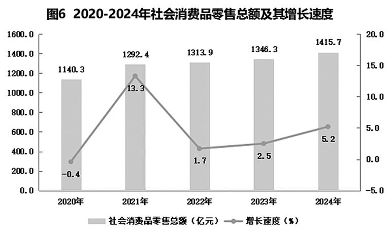 全年全市社會消費(fèi)品零售總額1415.7億元,比上年增長5.2%。分城鄉(xiāng)看,城鎮(zhèn)消費(fèi)品零售額1222.1億元,增長4.8%;鄉(xiāng)村消費(fèi)品零售額193.6億元,增長6.4%。分行業(yè)看,批發(fā)業(yè)零售額486.6億元,增長4.4%;零售業(yè)零售額832.0億元,增長5.2%;住宿業(yè)零售額33.5億元,增長6.0%;餐飲業(yè)零售額63.5億元,增長10.7%。