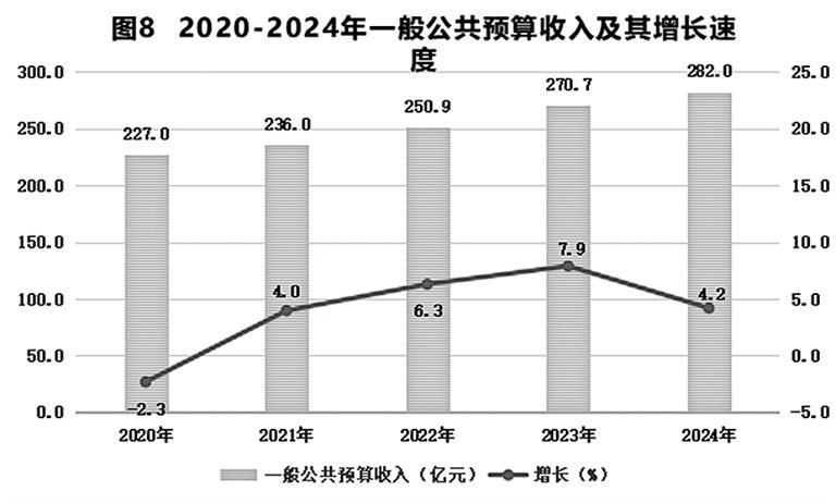 全年全市一般公共預(yù)算收入282.0億元,比上年增長4.2%,地方稅收收入189.0億元,增長3.0%,占一般公共預(yù)算收入的比重為67.0%。全年一般公共預(yù)算支出834.5億元,增長2.4%。