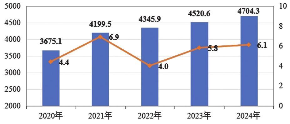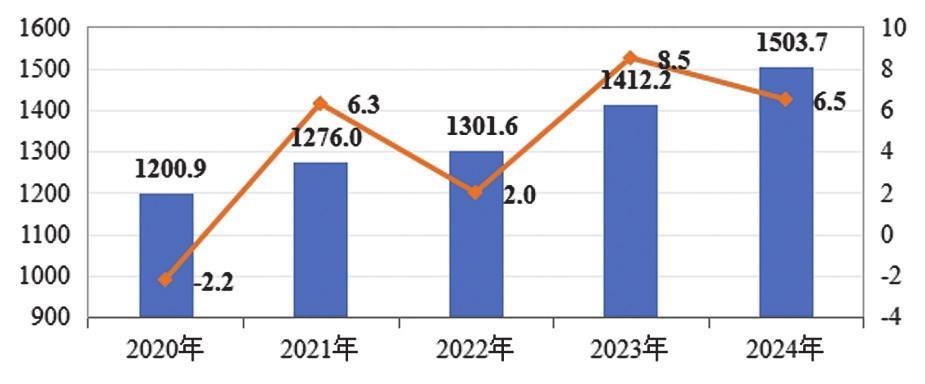 圖12020-2024年全市生產(chǎn)總值及增速(億元、%)