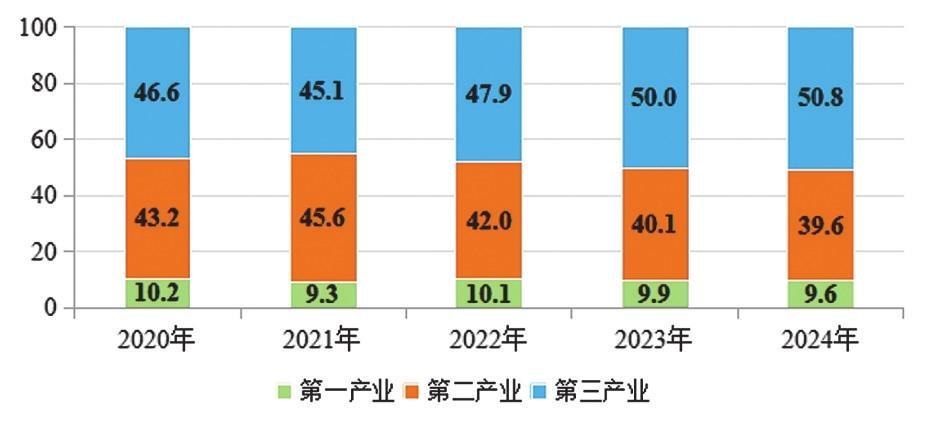 圖22020-2024年三次產(chǎn)業(yè)增加值占全市生產(chǎn)總值比重(%)
