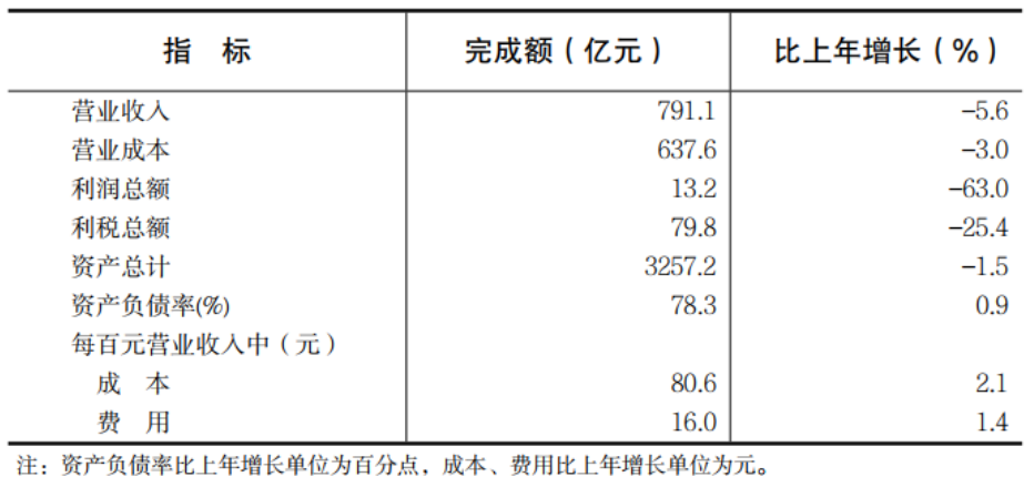 全年規(guī)模以上工業(yè)企業(yè)每百元營業(yè)收入中的成本為80.6元,比上年增加2.1元;營業(yè)收入利潤率為1.7%,下降2.6個(gè)百分點(diǎn);年末資產(chǎn)負(fù)債率為78.3%,比上年末提高0.9個(gè)百分點(diǎn)。