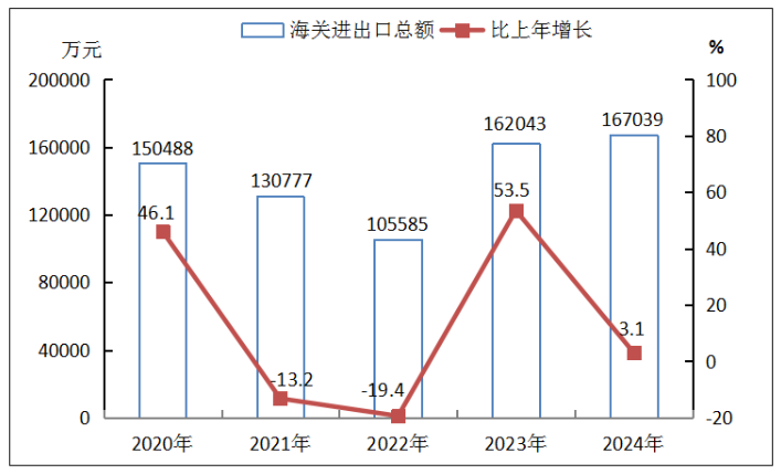 圖9? 2020年-2024年全市海關(guān)進(jìn)出口總額及其增長速度