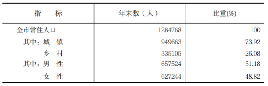 從城鄉(xiāng)結(jié)構(gòu)看,全市城鎮(zhèn)常住人口94.97萬人,比上年末增加1219人,鄉(xiāng)村常住人口33.51萬人,比上年末減少1.56萬人;城鎮(zhèn)化率為73.92%,比上年末提高0.91個(gè)百分點(diǎn)。
