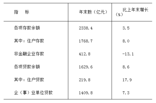 年末全市金融機(jī)構(gòu)本外幣各項(xiàng)存款余額2338.4億元,比上年末增長3.5%,增加78.4億元。各項(xiàng)貸款余額1629.6億元,比上年末增長8.6%,增加129.2億元。