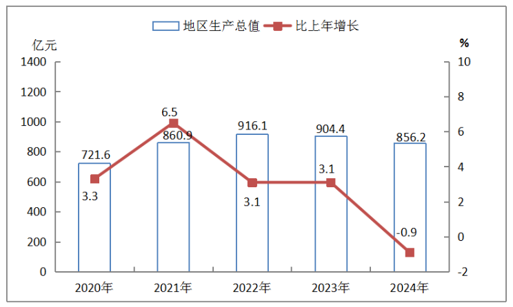 初步核算,全年實(shí)現(xiàn)地區(qū)生產(chǎn)總值856.2億元,按不變價(jià)格計(jì)算,下降0.9%。其中,第一產(chǎn)業(yè)增加值17.3億元,增長3.5%;第二產(chǎn)業(yè)增加值380.5億元,下降7.0%;第三產(chǎn)業(yè)增加值458.4億元,增長3.5%。一、二、三產(chǎn)比重分別為2.0%、44.5%、53.5%。人均地區(qū)生產(chǎn)總值66274元,按2024年平均匯率計(jì)算為9306美元。