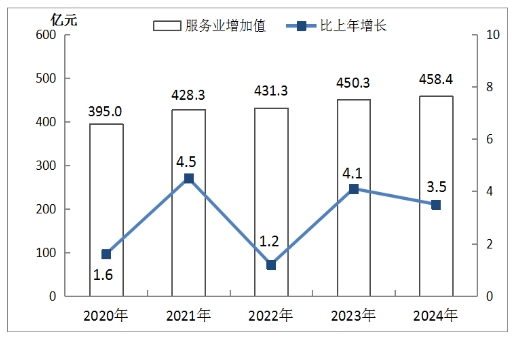 全年服務(wù)業(yè)增加值458.4億元,按不變價(jià)格計(jì)算,比上年增長3.5%。其中,批發(fā)和零售業(yè)增加值52.6億元,增長2.2%;交通運(yùn)輸、倉儲(chǔ)和郵政業(yè)增加值33.7億元,下降6.7%;住宿和餐飲業(yè)增加值8.5億元,增長2.0%;金融業(yè)增加值58.3億元,增長10.2%;房地產(chǎn)業(yè)增加值51.0億元,下降2.2%;營利性服務(wù)業(yè)增加值68.2億元,增長20.0%;非營利性服務(wù)業(yè)增加值184.3億元,下降0.3%。全年規(guī)模以上服務(wù)業(yè)企業(yè)營業(yè)收入比上年下降0.01%,利潤總額下降16.0%。