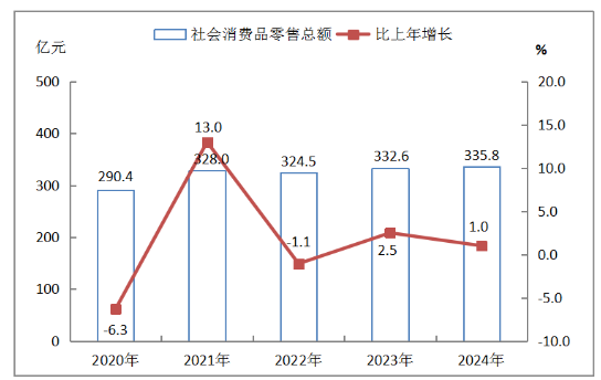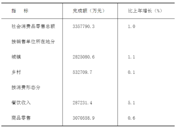 全年社會(huì)消費(fèi)品零售總額完成335.8億元,比上年增長1.0%。按經(jīng)營地統(tǒng)計(jì),城鎮(zhèn)消費(fèi)品零售額282.5億元,增長1.1%;鄉(xiāng)村消費(fèi)品零售額53.3億元,增長0.1%;按消費(fèi)類型統(tǒng)計(jì),商品零售額307.1億元,增長0.6%;餐飲收入28.7億元,增長5.1%。