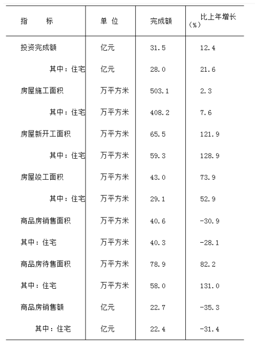 全年房地產(chǎn)開發(fā)投資31.5億元,增長12.4%。其中:住宅投資28.0億元,增長21.6%;商業(yè)營業(yè)用房投資0.8億元,下降30.2%。