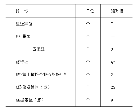 全市共有星級賓館7個(gè),其中,四星級3個(gè)。旅行社47個(gè),其中,經(jīng)營出境旅游業(yè)務(wù)的2個(gè)。A級景區(qū)23個(gè),其中,4A級9個(gè)。?