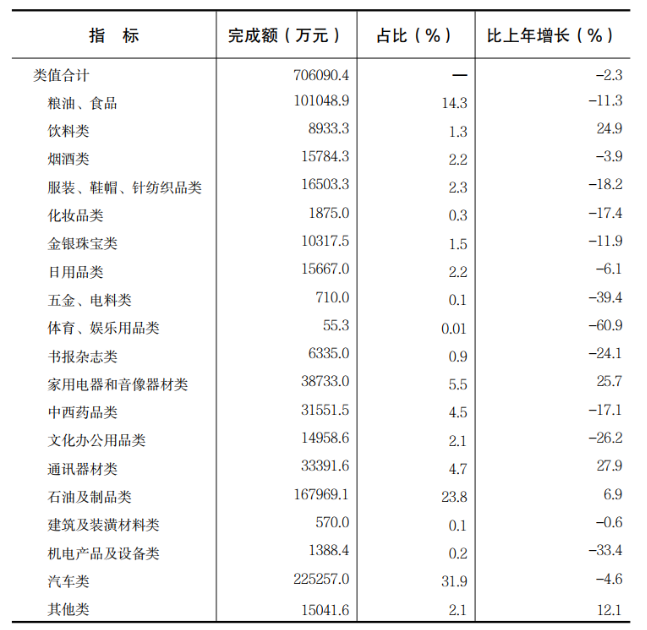 全年限額以上單位消費(fèi)品零售額74.6億元,下降2.6%。其中,糧油、食品類零售額下降11.3%,石油及制品類增長6.9%,汽車類下降4.6%。