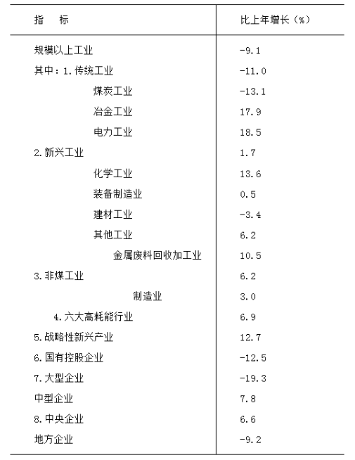 全市全部工業(yè)增加值350.2億元,按不變價(jià)格計(jì)算,比上年下降6.5%。規(guī)模以上工業(yè)增加值下降9.1%。規(guī)模以上工業(yè)中,煤炭工業(yè)增加值下降13.1%,非煤工業(yè)增加值增長6.2%;分門類看,采礦業(yè)下降12.9%,制造業(yè)增長3.0%,電力、熱力、燃?xì)饧八a(chǎn)和供應(yīng)業(yè)增長15.1%。