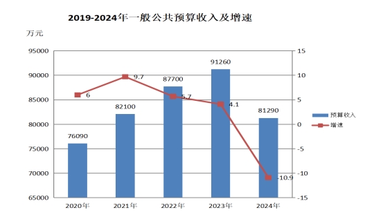 2024年,全縣一般公共預(yù)算收入完成81290萬(wàn)元,占調(diào)整預(yù)算的90.3%,同比下降10.9%。其中:稅收收入完成52989萬(wàn)元,占調(diào)整預(yù)算63000萬(wàn)元的84.1%,同比下降15.7%;非稅收入完成28301萬(wàn)元。稅收占比為65.2%。一般公共預(yù)算支出496596萬(wàn)元,同比增長(zhǎng)4.3%。