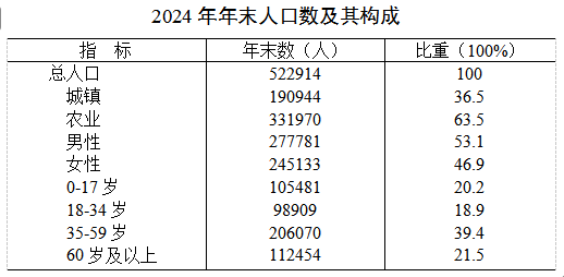 全市總?cè)丝?22914人,其中城鎮(zhèn)人口190944人,農(nóng)業(yè)人口331970人,戶籍人口城鎮(zhèn)化率36.52%,比上年下降0.06個(gè)百分點(diǎn)。全市常住人口42.41萬(wàn)人,其中城鎮(zhèn)人口25.29萬(wàn)人,農(nóng)村人口17.12萬(wàn)人,常住人口城鎮(zhèn)化率59.63%。全年出生人口3078人,死亡人口3446人。2024年岳陽(yáng)市臨湘市人民政府國(guó)民經(jīng)濟(jì)和社會(huì)發(fā)展統(tǒng)計(jì)公報(bào)(2025年更新)