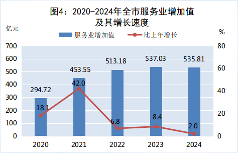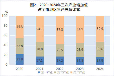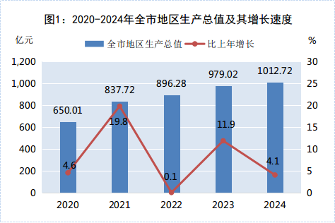 初步核算,2024年全市地區(qū)生產(chǎn)總值1012.72億元,按不變價格計算(下同),比上年增長4.1%。其中,第一產(chǎn)業(yè)增加值166.89億元,比上年增長3.2%;第二產(chǎn)業(yè)增加值310.02億元,比上年增長9.4%;第三產(chǎn)業(yè)增加值535.81億元,比上年增長2.0%。三次產(chǎn)業(yè)占GDP的比重分別為16.5%、30.6%、52.9%。第一產(chǎn)業(yè)、第二產(chǎn)業(yè)增加值比重較上年分別提高0.2、1.7個百分點,第三產(chǎn)業(yè)增加值比重較上年下降2.0個百分點。三次產(chǎn)業(yè)分別拉動GDP增長0.5、2.5、1.1個百分點。全年人均地區(qū)生產(chǎn)總值99580元,比上年增長4.1%。