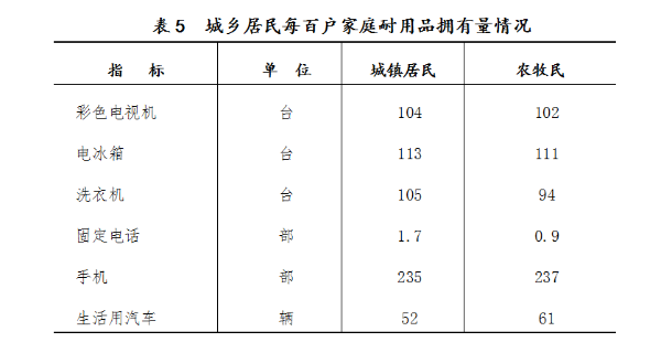 城鎮(zhèn)居民每百戶擁有彩色電視機(jī)104臺,電冰箱113臺,洗衣機(jī)105臺,生活用汽車52輛,固定電話1.7部,手機(jī)235部;農(nóng)牧民家庭每百戶擁有彩色電視機(jī)102臺,電冰箱111臺,洗衣機(jī)94臺,生活用汽車61輛,固定電話0.9部,手機(jī)237部。(見表5)