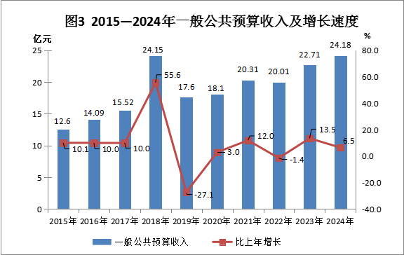 全年財政總收入35.54億元,比上年增長10.2%。一般公共預算收入24.18億元,增長6.5%。一般公共預算支出54.83億元,比上年下降3.4%,其中,社會保障與就業(yè)支出下降2.9%,公共安全支出增長4.7%,城鄉(xiāng)社區(qū)支出增長40.2%,衛(wèi)生健康支出下降8.7%,教育支出下降16.4%。