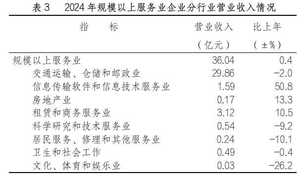 全年服務業(yè)增加值133.4億元,比上年增長10.4%。規(guī)模以上服務業(yè)[3]企業(yè)營業(yè)收入36.04億元,增長0.4%。