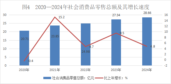 全年全縣社會消費品零售總額28.66億元,比上年增長4.8%。按經(jīng)營地統(tǒng)計,城鎮(zhèn)消費品零售額24.62億元,增長9.7%;鄉(xiāng)村消費品零售額4.04億元,上升7.5%。按消費類型統(tǒng)計,商品零售額25.58億元,增長5.0%;餐飲收入額3.08億元,增長2.8%。? ??全年批發(fā)業(yè)實現(xiàn)商品銷售額9.24億元,比上年增長11.9%;零售業(yè)商品銷售額22.27億元,增長11.0%;住宿業(yè)營業(yè)額0.65億元,增長6.6%;餐飲業(yè)營業(yè)額5.18億元,增長7.8%。