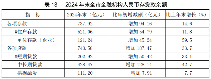 年末全市金融機(jī)構(gòu)本外幣各項(xiàng)存款余額741.84億元,比上年末增長14.6%;金融機(jī)構(gòu)本外幣各項(xiàng)貸款余額743.59億元,增長33.7%。