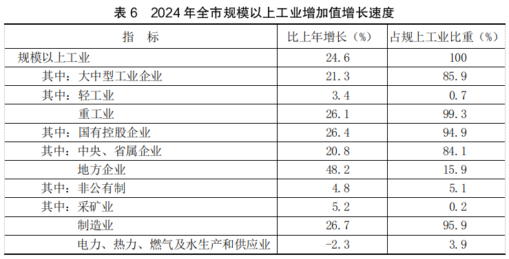 全年全市規(guī)模以上工業(yè)增加值比上年增長24.6%。分隸屬關(guān)系看,中央、省屬企業(yè)增長20.8%,地方企業(yè)增長48.2%。分輕重工業(yè)看,輕工業(yè)增長3.4%,重工業(yè)增長26.1%。分門類看,采礦業(yè)增長5.2%,制造業(yè)增長26.7%,電力、熱力、燃?xì)饧八a(chǎn)和供應(yīng)業(yè)下降2.3%。