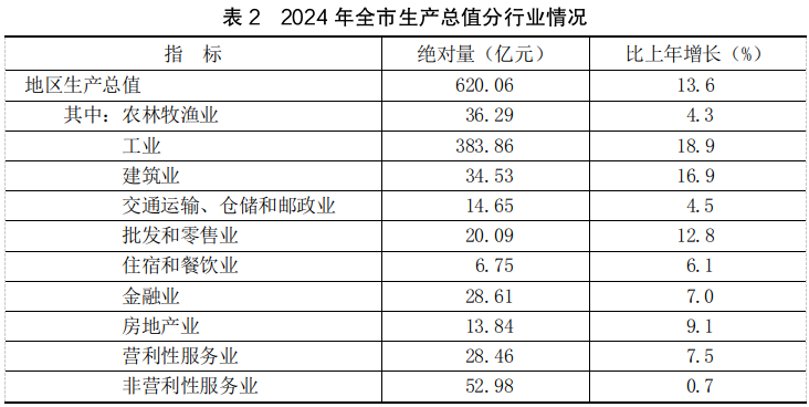 初步核算,全年全市地區(qū)生產(chǎn)總值620.06億元,按不變價(jià)格計(jì)算,比上年增長13.6%,其中,第一產(chǎn)業(yè)增加值33.77億元,增長4.6%;第二產(chǎn)業(yè)增加值418.25億元,增長18.7%;第三產(chǎn)業(yè)增加值168.03億元,增長5.4%。三次產(chǎn)業(yè)結(jié)構(gòu)比為5.4:67.5:27.1。按常住人口計(jì)算,人均地區(qū)生產(chǎn)總值143784元,比上年增長14.1%。