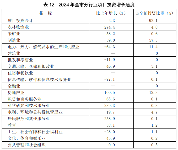 全年項(xiàng)目投資增長2.3%,其中制造業(yè)投資增長59.0%,電力、熱力、燃?xì)饧八纳a(chǎn)和供應(yīng)業(yè)投資下降64.3%,交通運(yùn)輸、倉儲和郵政業(yè)投資下降46.9%,水利、環(huán)境和公共設(shè)施管理業(yè)投資增長19.7%。