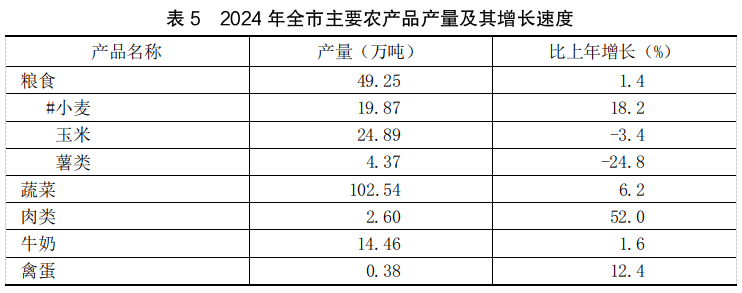 全年全市農(nóng)作物播種面積135.13萬畝,比上年下降2.9%。其中:糧食作物播種面積94.20萬畝,下降0.2%;糧食產(chǎn)量49.25萬噸,增長1.4%。蔬菜播種面積27.09萬畝,下降7.1%;蔬菜產(chǎn)量102.54萬噸,增長6.2%。
