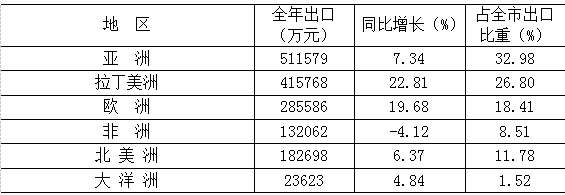 2024年,全市對亞洲出口51.16億元,同比增長7.3%,占出口總額33.0%;對拉丁美洲出口41.58億元,同比增長22.8%,占出口總額26.8%;對歐洲出口28.56億元,同比增長19.7%,占出口總額18.4%(主要出口地區(qū)情況見表二)。紡織產(chǎn)品出口額66.08億元,同比增長11.1%,占出口總額45.6%;車輛及零部件出口14.83億元,同比增長13.3%,占出口總額9.6%;蓄電池出口13.91億元,同比增長27.0%,占出口總額9.0%(主要出口產(chǎn)品情況見表三)。