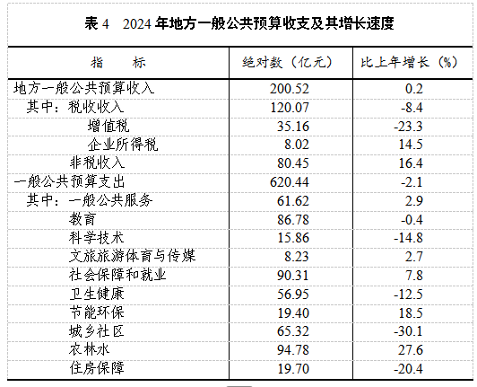全年一般公共預(yù)算地方收入200.52億元,比上年增長(zhǎng)0.2%,其中:稅收收入120.07億元,下降8.4%。稅收收入中,增值稅35.16億元,下降23.3%;企業(yè)所得稅8.02億元,增長(zhǎng)14.5%。一般公共預(yù)算支出620.44億元,下降2.1%。