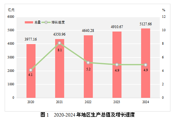 根據(jù)地區(qū)生產(chǎn)總值統(tǒng)一核算結(jié)果,全年地區(qū)生產(chǎn)總值5127.66億元,比上年增長(zhǎng)4.9%。其中:第一產(chǎn)業(yè)增加值500.30億元,增長(zhǎng)3.1%;第二產(chǎn)業(yè)增加值1864.89億元,增長(zhǎng)4.6%;第三產(chǎn)業(yè)增加值2762.47億元,增長(zhǎng)5.5%。按常住人口計(jì)算,人均地區(qū)生產(chǎn)總值102770元,增長(zhǎng)5.2%。