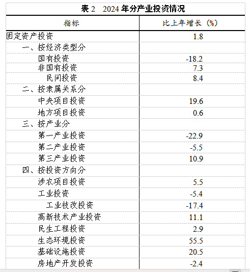 全市固定資產(chǎn)投資比上年增長(zhǎng)1.8%。分產(chǎn)業(yè)看,第一產(chǎn)業(yè)投資下降22.9%,第二產(chǎn)業(yè)投資下降5.5%,第三產(chǎn)業(yè)投資增長(zhǎng)10.9%。分經(jīng)濟(jì)類型看,國(guó)有投資下降18.2%;非國(guó)有投資增長(zhǎng)7.3%,其中,民間投資增長(zhǎng)8.4%。分投資方向看,工業(yè)投資下降5.4%,民生工程投資增長(zhǎng)2.9%,生態(tài)環(huán)境投資增長(zhǎng)55.5%,基礎(chǔ)設(shè)施投資增長(zhǎng)20.5%,高新技術(shù)產(chǎn)業(yè)投資增長(zhǎng)11.1%,工業(yè)技改投資下降17.4%。