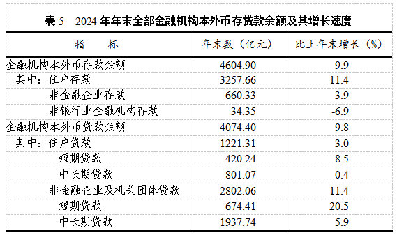 年末全部金融機(jī)構(gòu)本外幣各項(xiàng)存款余額4604.90億元,比上年增長(zhǎng)9.9%。其中:住戶存款3257.66億元,增長(zhǎng)11.4%;非金融企業(yè)存款660.33億元,增長(zhǎng)3.9%;非銀行業(yè)金融機(jī)構(gòu)存款34.35億元,下降6.9%。全部金融機(jī)構(gòu)本外幣各項(xiàng)貸款余額4074.40億元,增長(zhǎng)9.8%。其中:住戶貸款1221.31億元,增長(zhǎng)3.0%;非金融企業(yè)及機(jī)關(guān)團(tuán)體貸款2802.06億元,增長(zhǎng)11.4%。