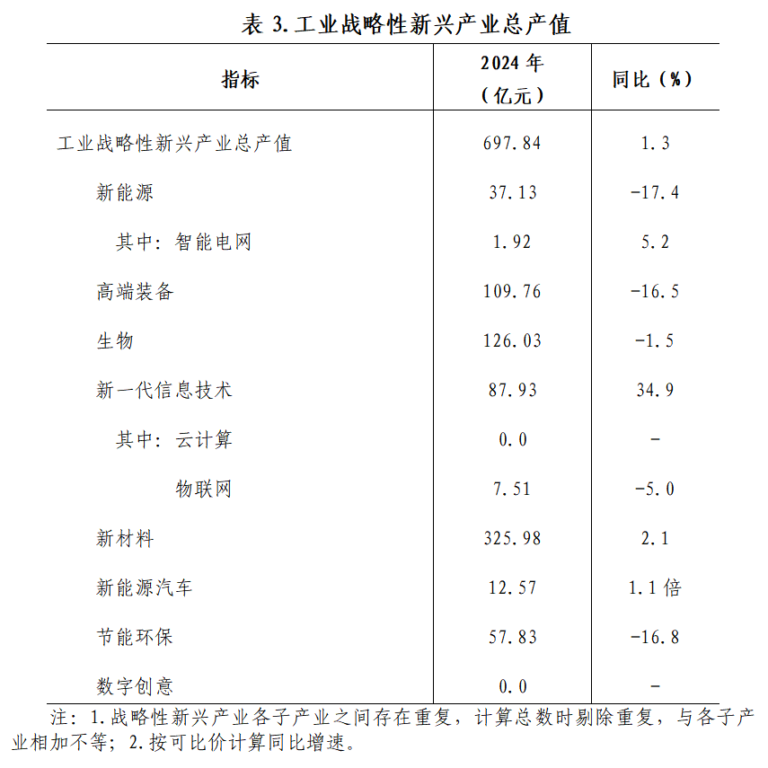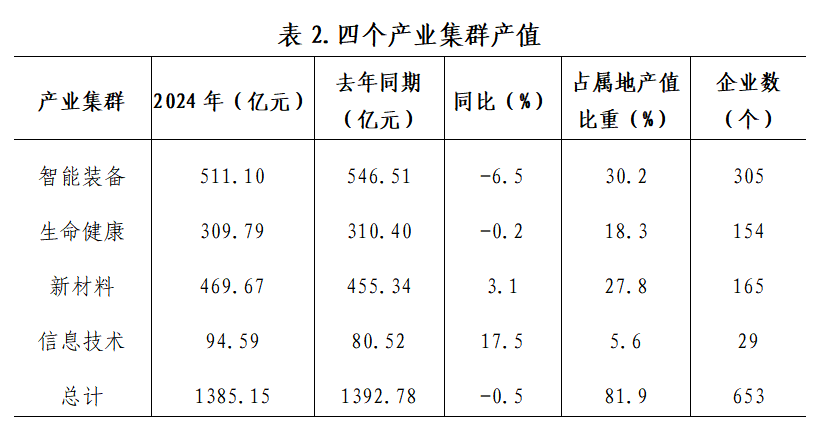 信息技術(shù)產(chǎn)業(yè)蓬勃發(fā)展。2024年,四個(gè)產(chǎn)業(yè)集群共有653家企業(yè),分屬于智能裝備、生命健康、新材料和信息技術(shù),共完成工業(yè)產(chǎn)值1385.15億元,同比下降0.5%,占屬地規(guī)上工業(yè)總產(chǎn)值比重為81.9%,其中,信息技術(shù)產(chǎn)業(yè)同比增長(zhǎng)17.5%(見(jiàn)表2);工業(yè)戰(zhàn)略性新興產(chǎn)業(yè)總產(chǎn)值完成697.84億元,按可比價(jià)計(jì)算,同比增長(zhǎng)1.3%,占規(guī)上工業(yè)總產(chǎn)值比重為27.6%(見(jiàn)表3)。