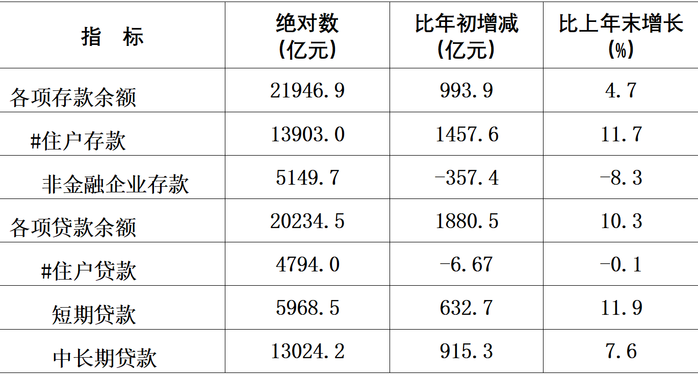 金融存貸款穩(wěn)步增長。年末全市金融機(jī)構(gòu)本外幣存款余額21946.9億元,比上年末增長4.7%,比年初增加993.9億元。其中,住戶存款增加1457.6億元,非金融企業(yè)存款減少357.4億元。年末金融機(jī)構(gòu)本外幣貸款余額20234.5億元,比上年末增長10.3%,比年初增加1880.5億元。其中,中長期貸款增加915.3億元,短期貸款增加632.7億元。