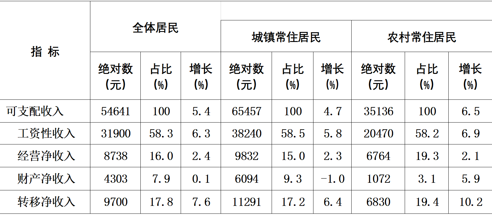 居民收支平穩(wěn)增長。全年居民人均可支配收入54641元,比上年增長5.4%。其中,工資性收入31900元,增長6.3%;經(jīng)營凈收入8738元,增長2.4%;財產(chǎn)凈收入4303元,增長0.1%;轉(zhuǎn)移凈收入9700元,增長7.6%。城鎮(zhèn)居民人均可支配收入65457元,增長4.7%;農(nóng)村居民人均可支配收入35136元,增長6.5%。城鄉(xiāng)居民人均收入比為1.863:1,比上年縮小0.033。全年居民人均消費(fèi)支出34363元,比上年增長2.7%。按常住地分,城鎮(zhèn)居民人均消費(fèi)支出39621元,增長1.9%;農(nóng)村居民人均消費(fèi)支出24882元,增長4.5%。