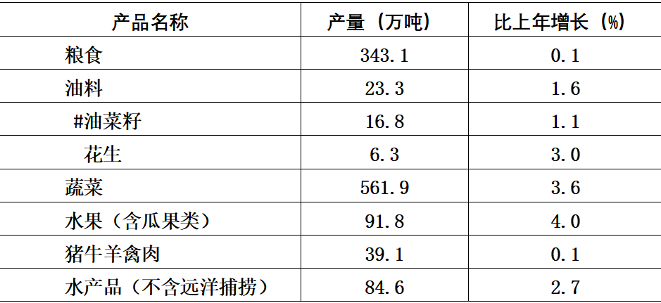 糧食產(chǎn)量總體穩(wěn)定。全年糧食總產(chǎn)量343.1萬噸,比上年增長0.1%,持續(xù)5年保持在340萬噸以上。其中,夏糧總產(chǎn)量122.9萬噸,增長1.4%;秋糧總產(chǎn)量220.2萬噸,下降0.6%。全年油料產(chǎn)量23.3萬噸,增長1.6%;蔬菜產(chǎn)量561.9萬噸,增長3.6%;水果產(chǎn)量91.8萬噸,增長4.0%。