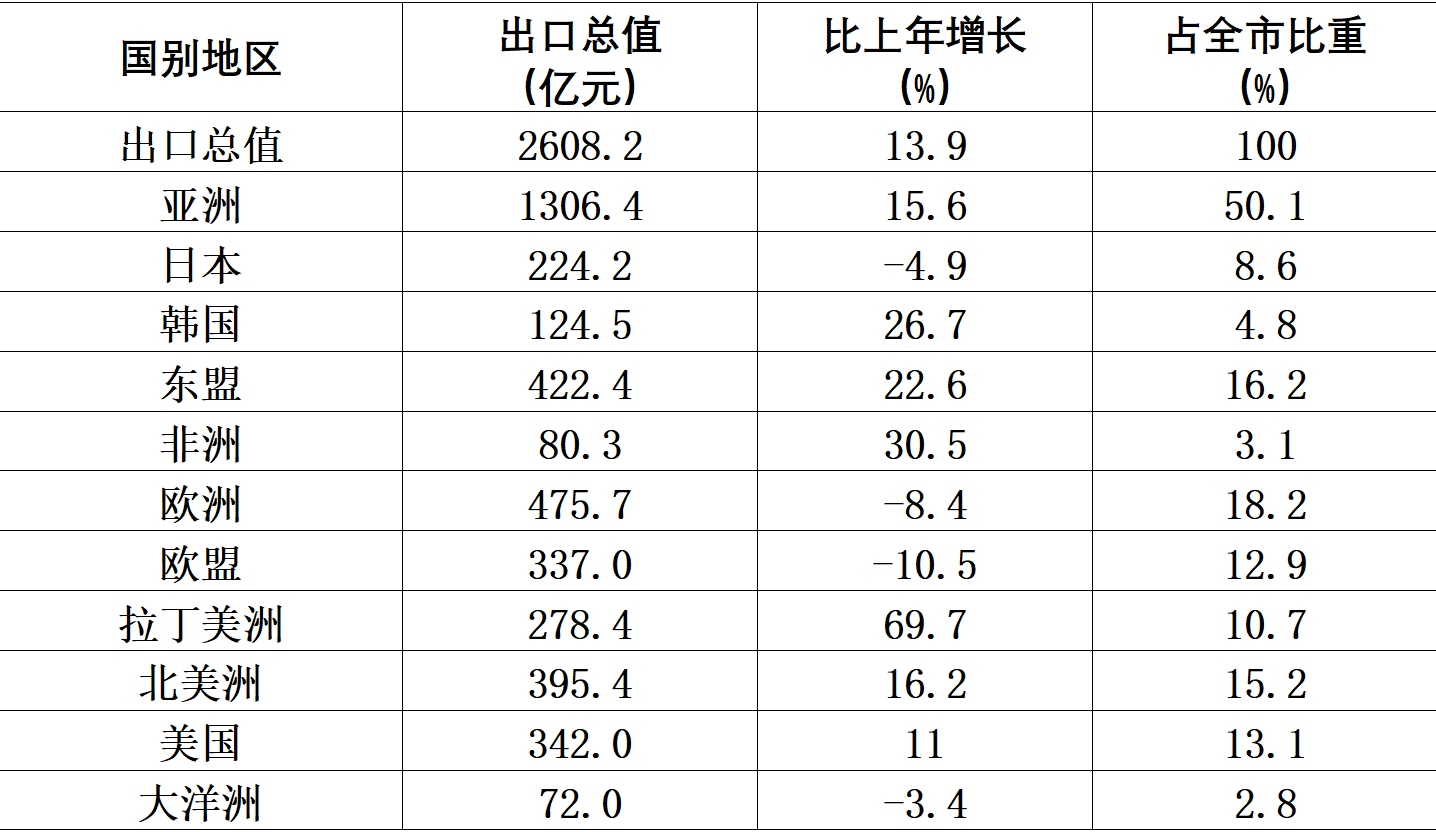 對外貿(mào)易穩(wěn)中提質(zhì)。全年外貿(mào)進(jìn)出口總值3949.9億元,比上年增長12.9%。其中,出口2608.2億元,增長13.9%;進(jìn)口1341.7億元,增長10.8%。從貿(mào)易方式看,一般貿(mào)易進(jìn)出口2611.6億元,增長9.8%,占進(jìn)出口總值的比重為66.1%;加工貿(mào)易進(jìn)出口1123.4億元,增長31.8%。從出口主體看,全市民營企業(yè)進(jìn)出口1875.5億元,外商投資企業(yè)進(jìn)出口1508.6億元。從出口產(chǎn)品看,船舶和海工平臺、紡織服裝、集成電路、集裝箱出口比上年分別增長86.2%、6.8%、63.8%、13.5%。從主要市場看,對美歐日等傳統(tǒng)市場進(jìn)出口1497.2億元,增長4.6%,占全市外貿(mào)總值比重為37.9%,“壓艙石”作用顯著?!耙粠б宦贰毖鼐€進(jìn)出口1998.6億元,增長17.9%,連續(xù)4年增長,高于全市外貿(mào)整體增速5.1個百分點(diǎn),占全市外貿(mào)總值比重為50.6%,首次超過5成。