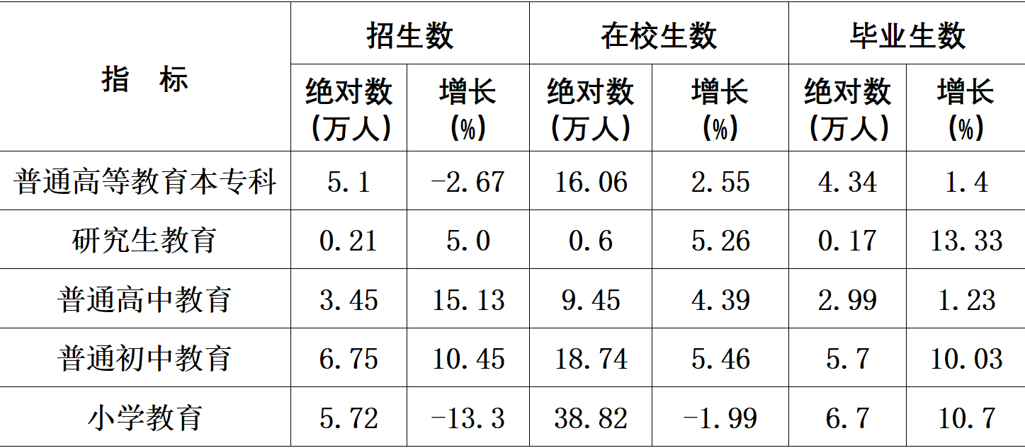 教育事業(yè)穩(wěn)步推進(jìn)。年末全市共有普通高校9所。普通高等教育本??普猩?.1萬人,在校生16.06萬人,畢業(yè)生4.34萬人。研究生教育招生0.21萬人,在校生0.6萬人,畢業(yè)生0.17萬人。中等職業(yè)教育在校生4.9萬人(不含技工學(xué)校)。特殊教育招生0.03萬人,在校生0.17萬人。幼兒園592所,在園幼兒13.2萬人。