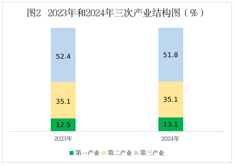 根據(jù)廣東省地區(qū)生產(chǎn)總值統(tǒng)一核算結(jié)果,2024年河源實(shí)現(xiàn)地區(qū)生產(chǎn)總值(初步核算數(shù))1407.72億元,比上年增長(zhǎng)2.2%。其中,第一產(chǎn)業(yè)增加值184.44億元,增長(zhǎng)5.0%,對(duì)地區(qū)生產(chǎn)總值增長(zhǎng)的貢獻(xiàn)率為28.9%,拉動(dòng)地區(qū)生產(chǎn)總值增長(zhǎng)0.6個(gè)百分點(diǎn);第二產(chǎn)業(yè)增加值493.78億元,增長(zhǎng)3.0%,對(duì)地區(qū)生產(chǎn)總值增長(zhǎng)的貢獻(xiàn)率為48.2%,拉動(dòng)地區(qū)生產(chǎn)總值增長(zhǎng)1.1個(gè)百分點(diǎn);第三產(chǎn)業(yè)增加值729.50億元,增長(zhǎng)0.9%,對(duì)地區(qū)生產(chǎn)總值增長(zhǎng)的貢獻(xiàn)率為22.9%,拉動(dòng)地區(qū)生產(chǎn)總值增長(zhǎng)0.5個(gè)百分點(diǎn)。三次產(chǎn)業(yè)結(jié)構(gòu)由上年的12.5:35.1:52.4調(diào)整為13.1:35.1:51.8,第一產(chǎn)業(yè)比重比上年提高了0.6個(gè)百分點(diǎn),第二產(chǎn)業(yè)比重與上年持平,第三產(chǎn)業(yè)比重比上年回落了0.6個(gè)百分點(diǎn)。人均地區(qū)生產(chǎn)總值49609元,增長(zhǎng)2.2%。