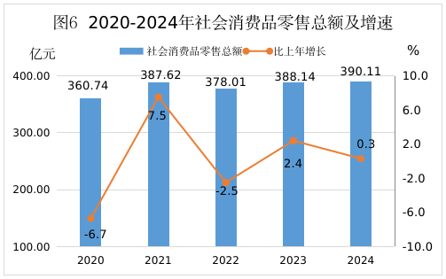 全年社會(huì)消費(fèi)品零售總額390.11億元,比上年增長(zhǎng)0.3%。按經(jīng)營(yíng)地統(tǒng)計(jì),城鎮(zhèn)消費(fèi)品零售額297.88億元,增長(zhǎng)0.1%;鄉(xiāng)村消費(fèi)品零售額92.23億元,增長(zhǎng)0.5%。從消費(fèi)類(lèi)型看,商品零售357.28億元,下降0.1%;餐飲收入32.83億元,增長(zhǎng)3.2%。