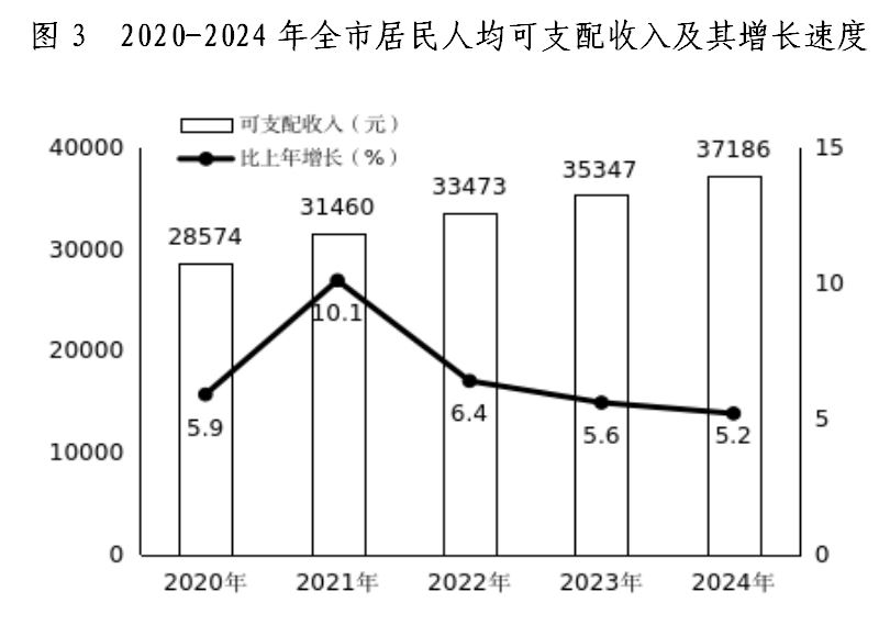 全年居民人均可支配收入37186元,比上年增長(zhǎng)5.2%。按常住地分,城鎮(zhèn)居民人均可支配收入46511元,增長(zhǎng)4.2%;農(nóng)村居民人均可支配收入26396元,增長(zhǎng)6.4%。