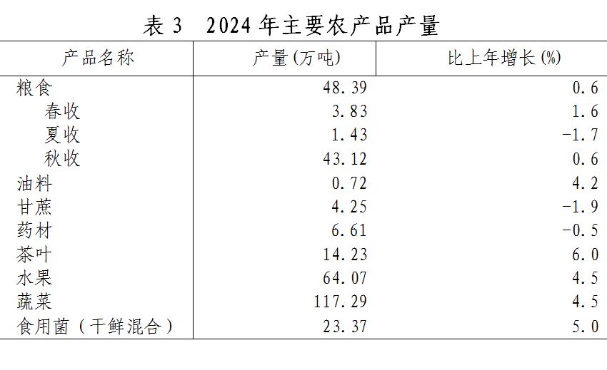 全年糧食播種面積136.02萬畝,比上年減少0.07萬畝。其中,稻谷面積86.79萬畝,減少0.24萬畝。全年糧食產(chǎn)量48.39萬噸,增加0.28萬噸。其中,稻谷36.24萬噸,增加0.1萬噸。