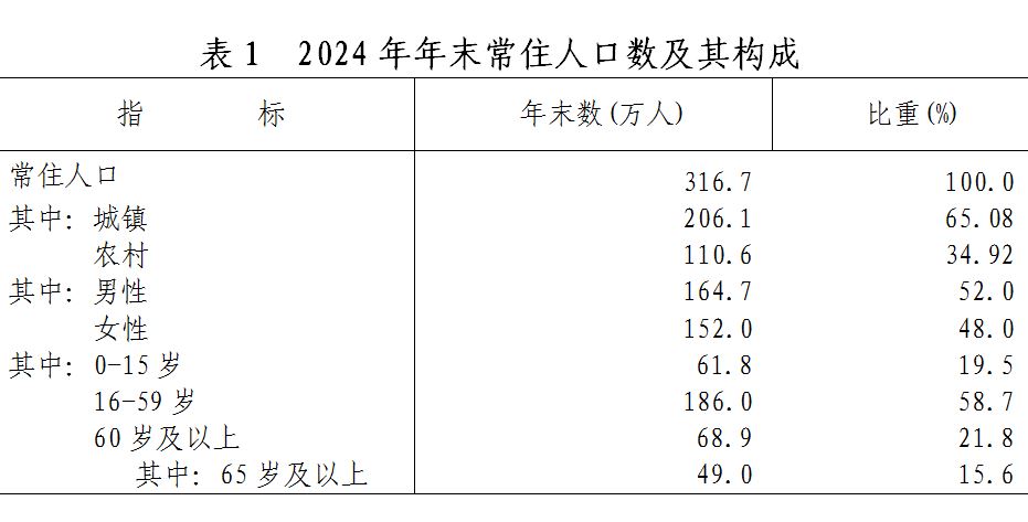 年末常住人口316.7萬人,比上年末增加1.0萬人。其中,城鎮(zhèn)常住人口206.1萬人,占總?cè)丝诒戎兀ǔW∪丝诔擎?zhèn)化率)為65.08%,比上年末提高1.12個(gè)百分點(diǎn)。全年出生率7.15‰,死亡率7.91‰,自然增長(zhǎng)率-0.76‰。年末戶籍人口352.45萬人,比上年末減少2.15萬人。